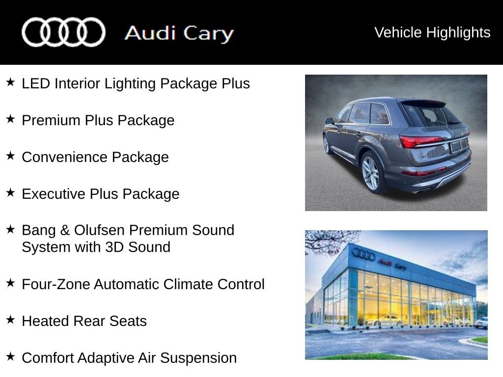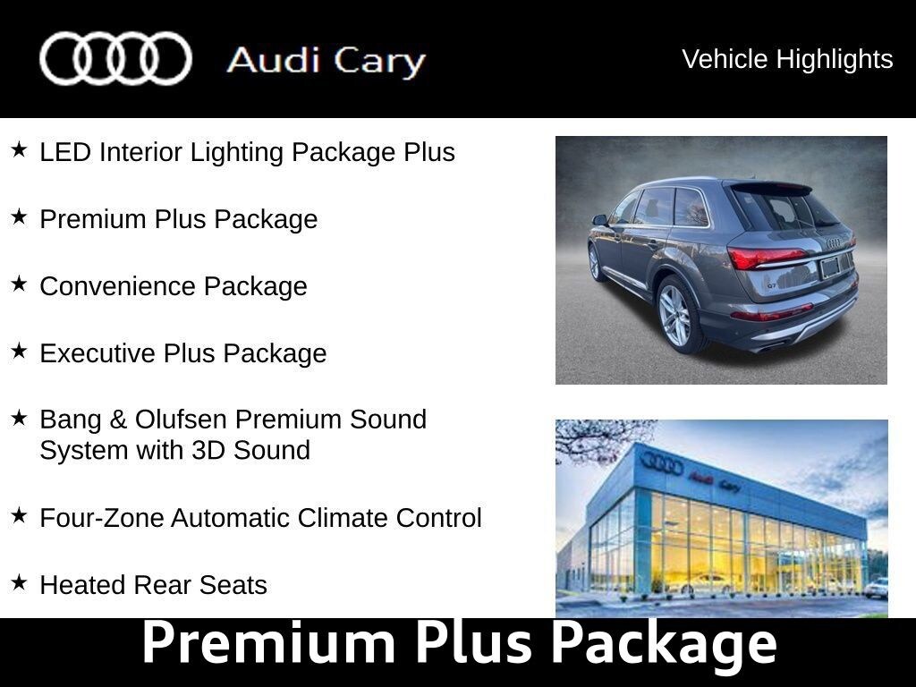 Samurai Gray Metallic 2025 Audi Q7 55 Premium Plus quattro 8-Speed Automatic with Tiptronic 3.0L TFSI quattro CARFAX One-Owner. Clean CARFAX. Bang & Olufsen Premium Sound System with 3D Sound, Comfort Adaptive Air Suspension, Control Buttons in Gloss Black with Haptic Feedback, Convenience Package, Dual-Pane Acoustic Glass For Side Windows, Executive Plus Package, Four-Zone Automatic Climate Control, Front Seats with Ventilation, Heated Rear Seats, Illuminated Door Sills, LED Interior Lighting Package Plus, Power Soft-Closing Doors, Premium Plus Package, Rear Door/Side Windows and Tailgate Sunshades, Traffic Sign Recognition, Wheels: 21" 5-Double-Spoke Design.