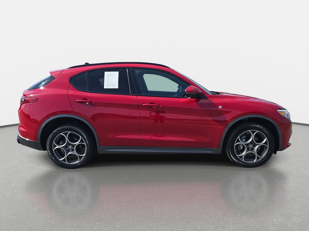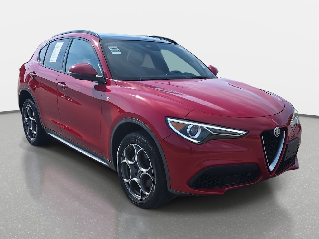 Alfa Rosso 2022 Alfa Romeo Stelvio Ti AWD 8-Speed Automatic I4 Alloy wheels, AM/FM radio: SiriusXM, Auto High-beam Headlights, Fully automatic headlights, Genuine wood console insert, Genuine wood dashboard insert, Genuine wood door panel insert, Heated front seats, Heated rear seats, ParkView Rear Back-Up Camera, Power 6-Way Adjustable Driver Seat, Power 6-Way Front Passenger Seat, Power Liftgate, Power moonroof, Quick Order Package 22G Ti, Rain sensing wipers, Silver Ti Badge, Vesuvio Gray Body Kit.