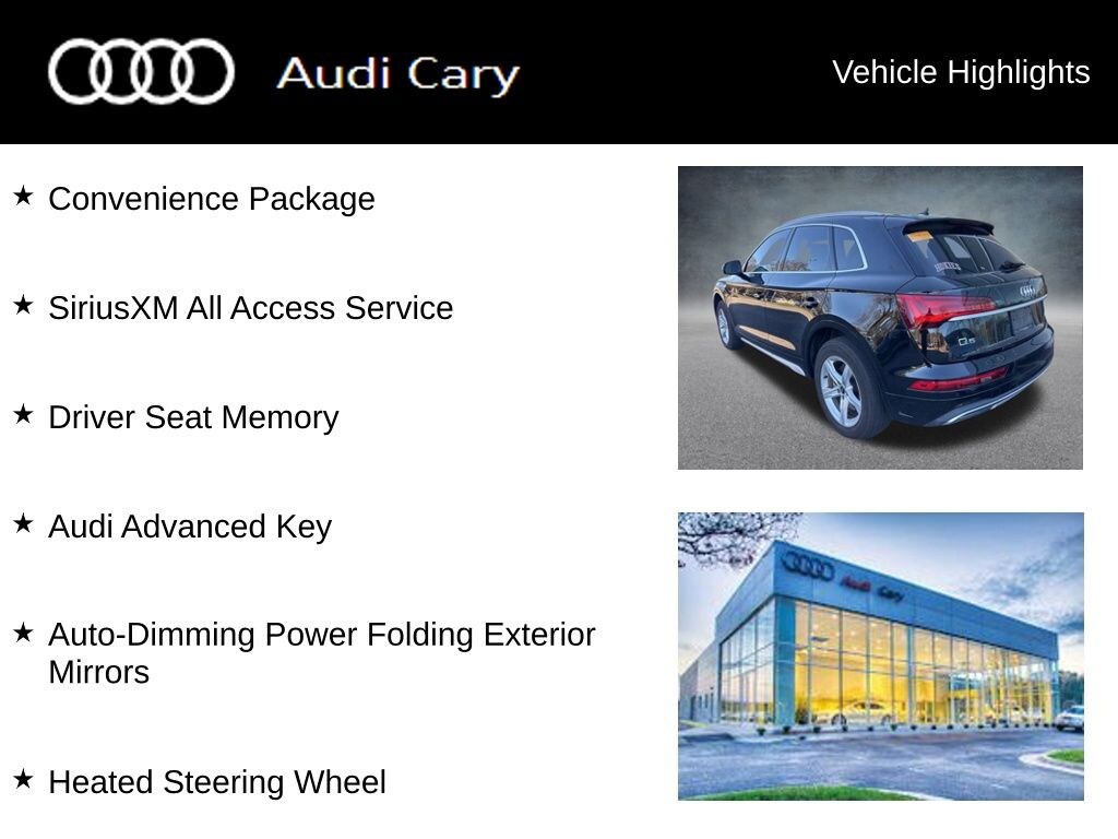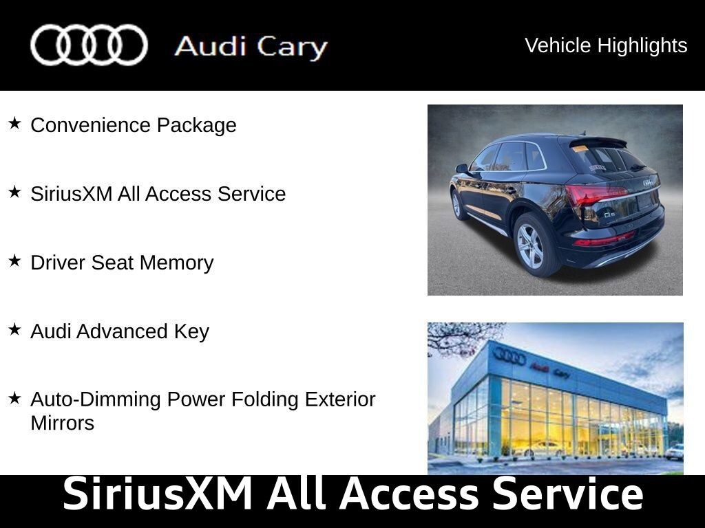 Brilliant Black 2021 Audi Q5 45 Premium quattro 7-Speed Automatic S tronic 2.0L Turbocharged quattro CARFAX One-Owner. Clean CARFAX. Black w/Leather Seating Surfaces, Audi Advanced Key, Auto-Dimming Power Folding Exterior Mirrors, Convenience Package, Driver Seat Memory, Heated Steering Wheel, SiriusXM All Access Service.